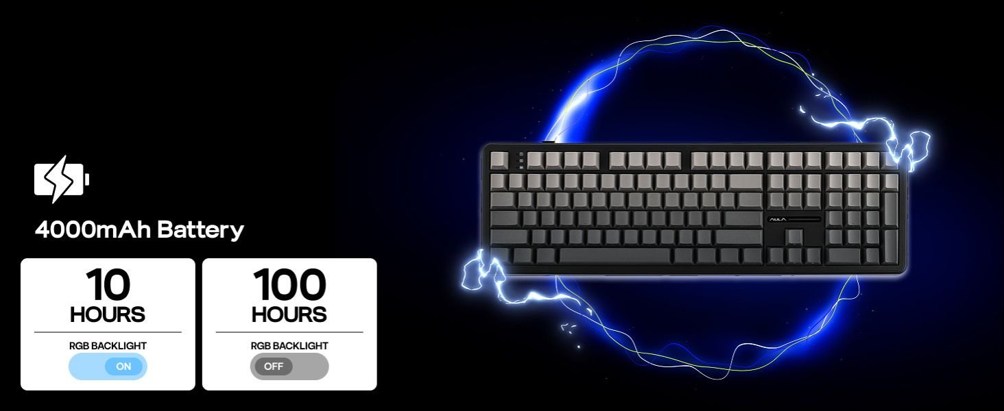 - Wireless Keyboard with Limitless Compatibility: Packed with 8000mAh rechargeable batteries, double the power average gaming keyboard offers, F108 Wireless Keyboard grants up to 100 hours of continuous gameplay at peak performance with backlight off. Its versatile Bluetooth mode offers swift transaction from PC, Mac Laptop to Android Tablet, while the 2.4GHz wireless and USB Cable mode promise competitive-level stability and responsiveness with 1000Hz polling rate