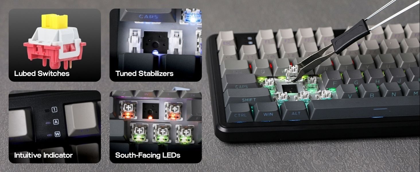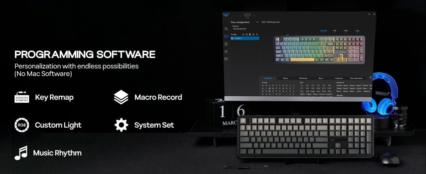 - Hot-Swappable Custom Keyboard: Customize each keystroke’s touch, acoustic feedback and the function it triggers, as the F108 custom keyboard supplies with its formidable setup. Test out the various typing feel of mainstream 3/5-pin mechanical nimbus switches with the F108 hot-swappable keyboard, and bask in the smooth and tactile touch of our pre-lubed nimbus linear switch that sounds creamy and satisfying, credit to the keyboard’s sound-dampening design. Experimenting the powerful programming software for key remapping, macro assigning and sensitivity adjustments, to step up your input speed, gaming competitivity and accessibility