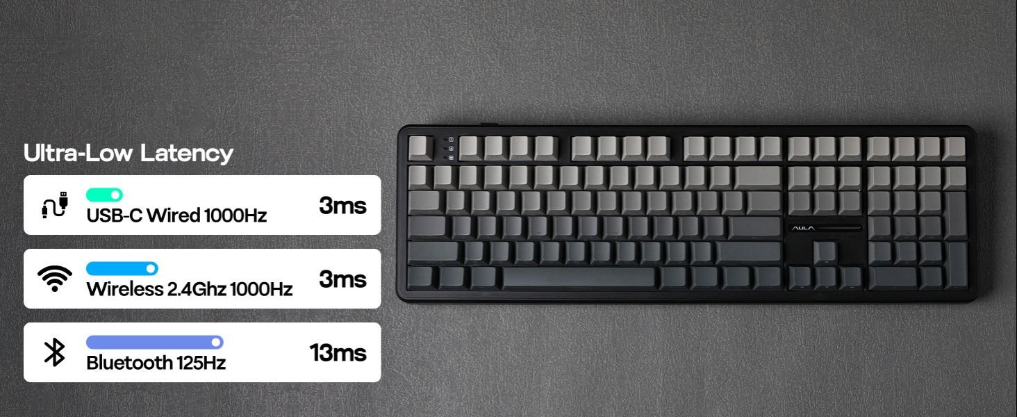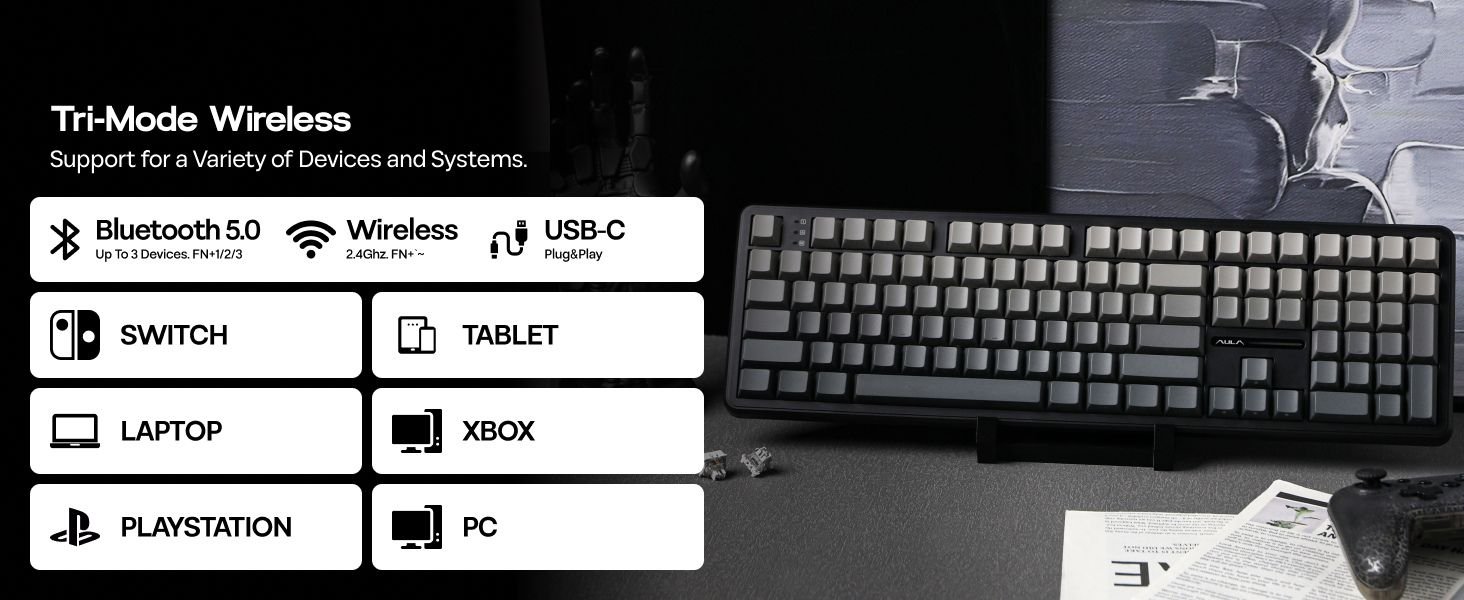 AULA F108 Tri-Mode Wireless Mechanical Gaming Keyboard combines full-size productivity and pro-level gaming performance. Featuring 108 anti-ghosting keys, Cherry-profile PBT side-engraved keycaps, and a creamy Nimbus linear switch, this keyboard ensures smooth, silent, and satisfying keystrokes. With Tri-Mode connectivity—Bluetooth, 2.4GHz wireless, and Type-C wired—you get seamless compatibility across PC, Mac, Android, and more.