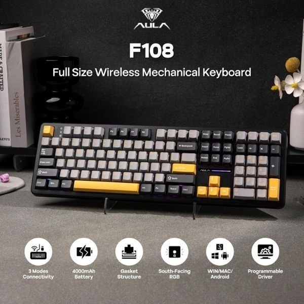 Whether you’re coding, streaming, or gaming, the AULA F108 mechanical keyboard gives you precision, personalization, and power—all in a sleek grey-yellow aesthetic.