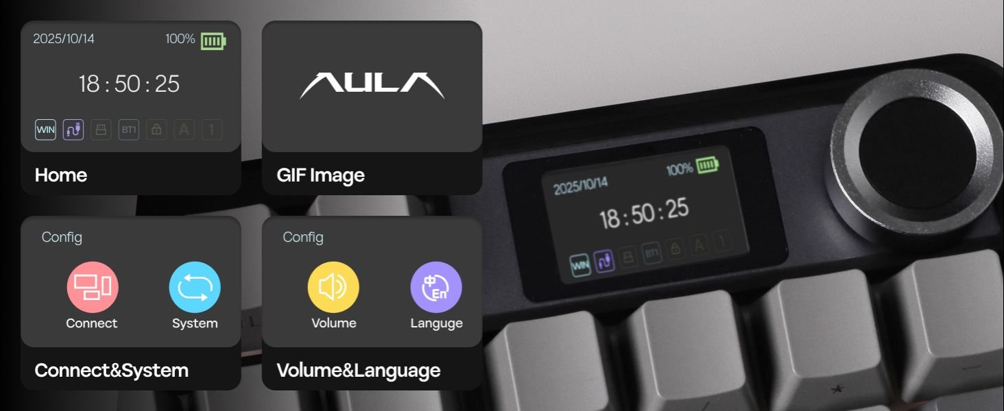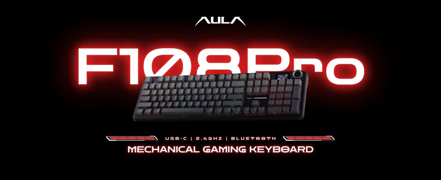 Elevate your setup with the AULA F108PRO Tri-Mode Wireless Mechanical Gaming Keyboard — a full-size 104-key powerhouse designed for gamers, creators, and professionals. Featuring hot-swappable Nimbus linear switches, a vibrant 1.14” customizable LCD screen, and an ergonomic volume control knob, this keyboard combines high-performance typing with smart productivity tools.