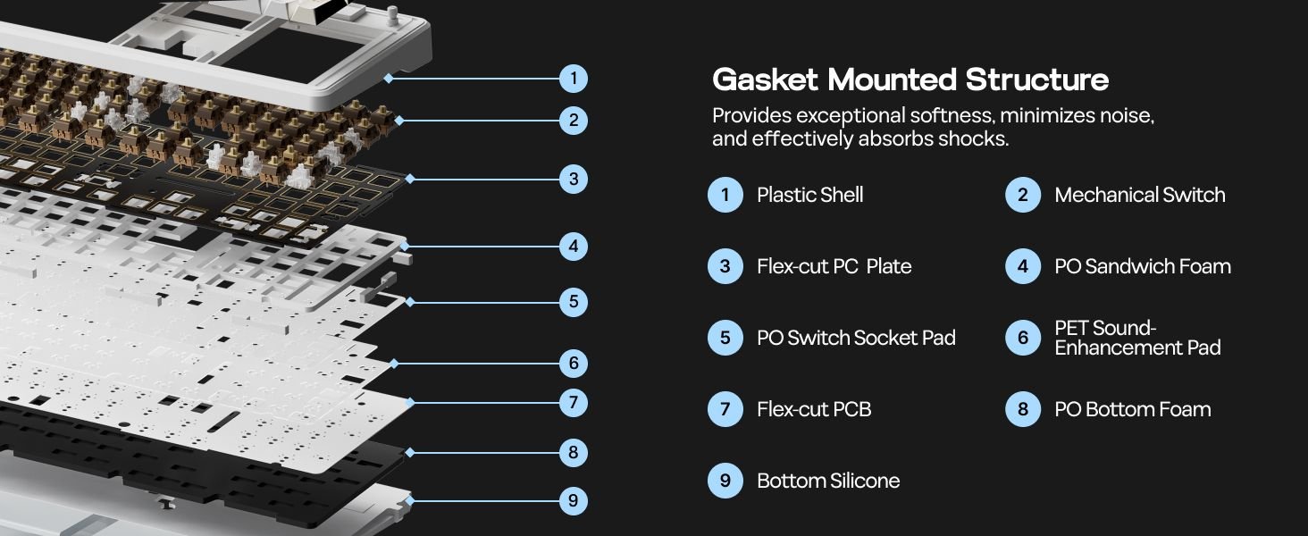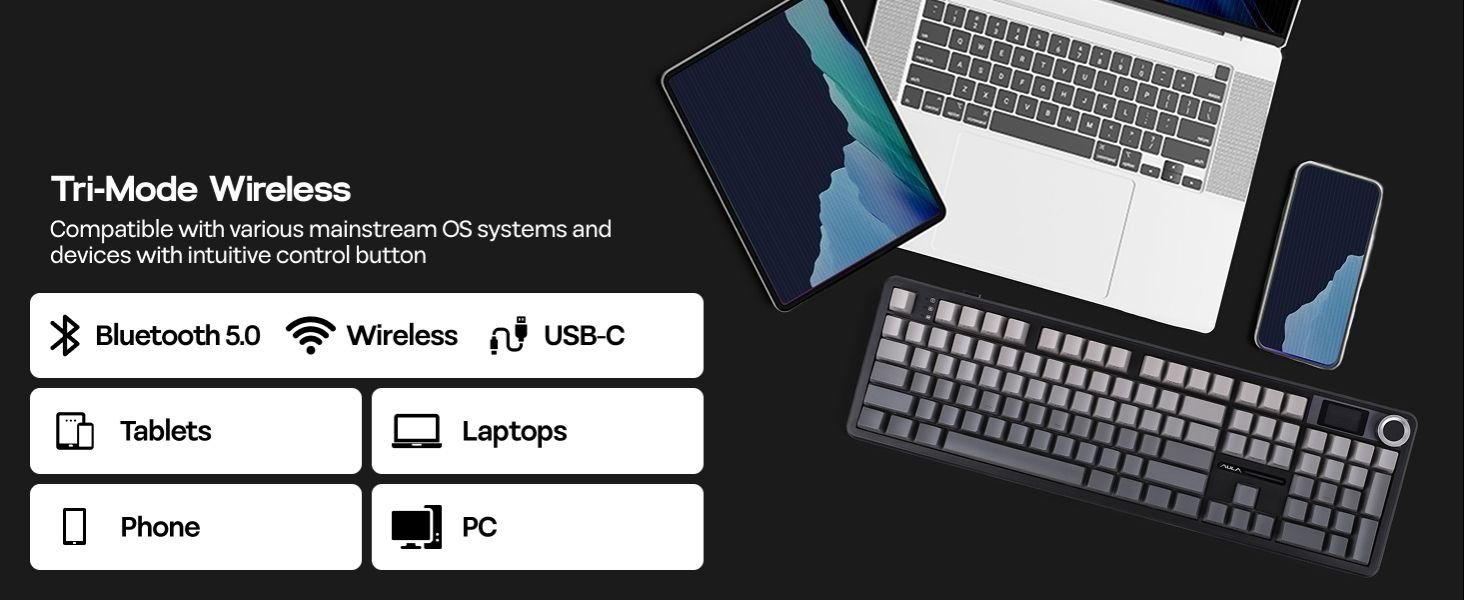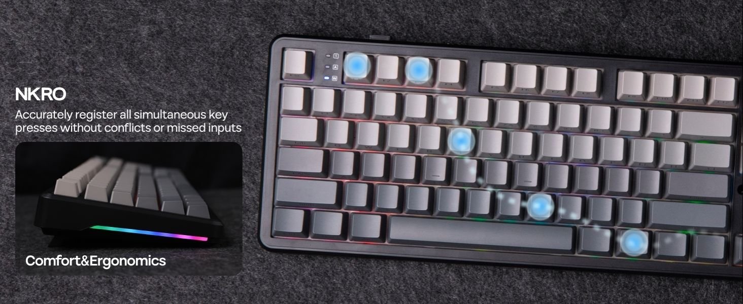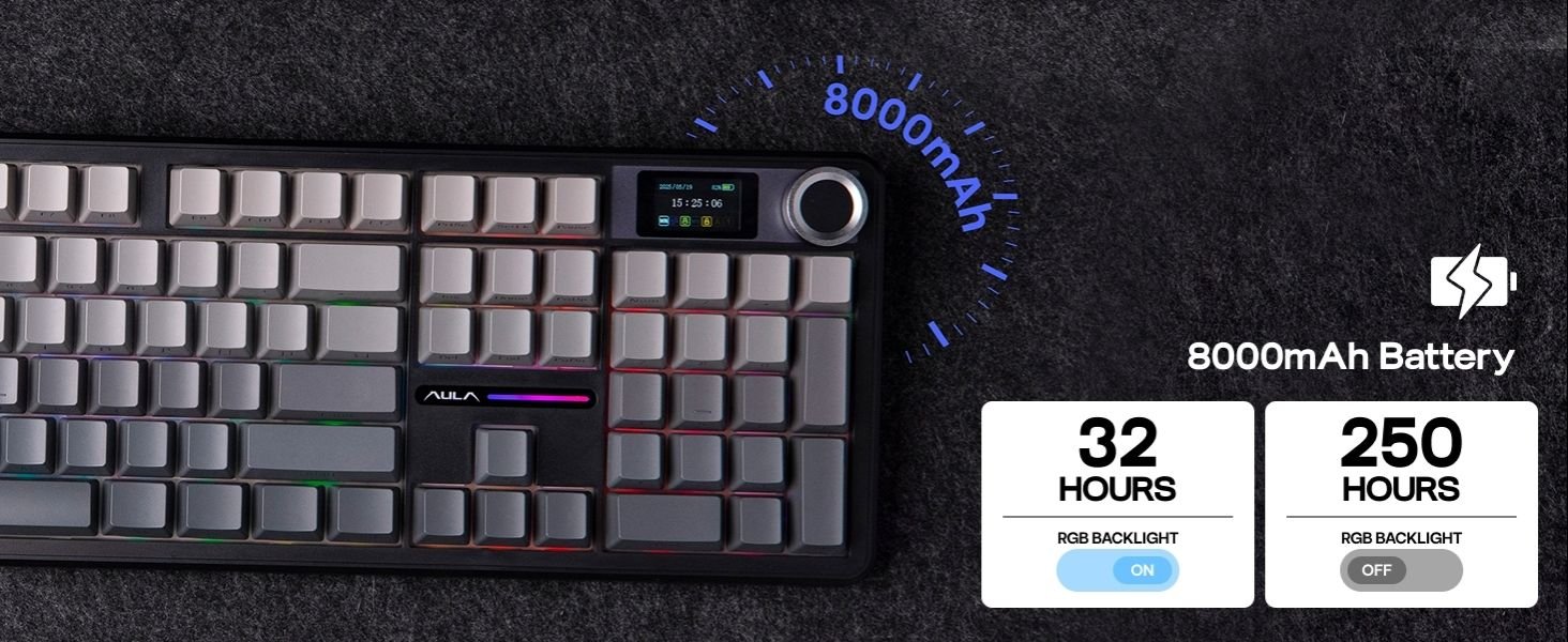 The 8000mAh rechargeable battery delivers up to 76 hours of gameplay with full RGB and screen usage, while tri-mode connectivity (Bluetooth 5.1, 2.4GHz wireless, and USB-C wired) ensures seamless switching between Windows, Mac, and Android devices. Its RGB backlight, PBT double-shot keycaps, and 5-layer sound-dampening design provide a creamy, satisfying sound profile for immersive typing or gaming.
