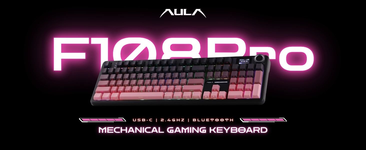 AULA F108PRO Side-Engraved Keycaps Full Size Tri-Mode Wireless Mechanical Gaming Keyboard with Screen & Knob | Gradient Pink, Graywood Switch (F108ProPW)