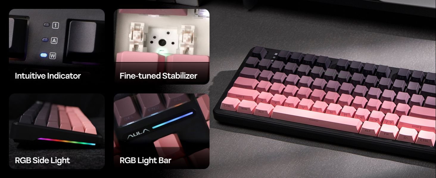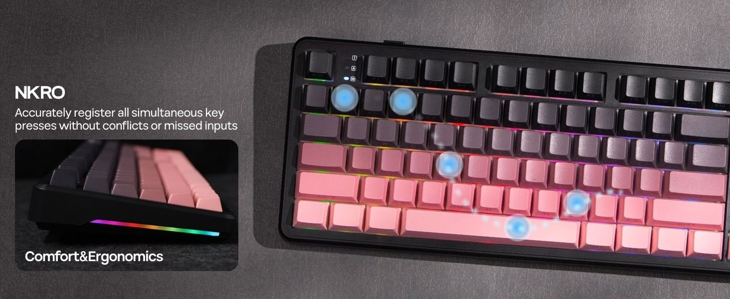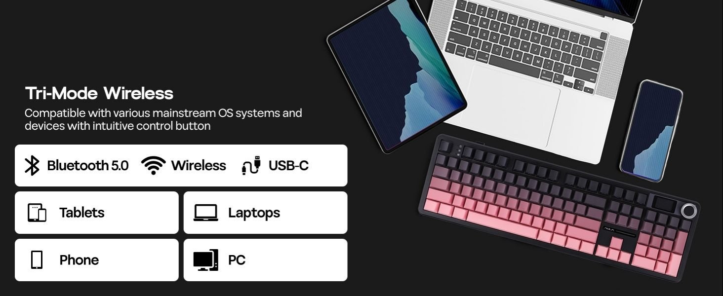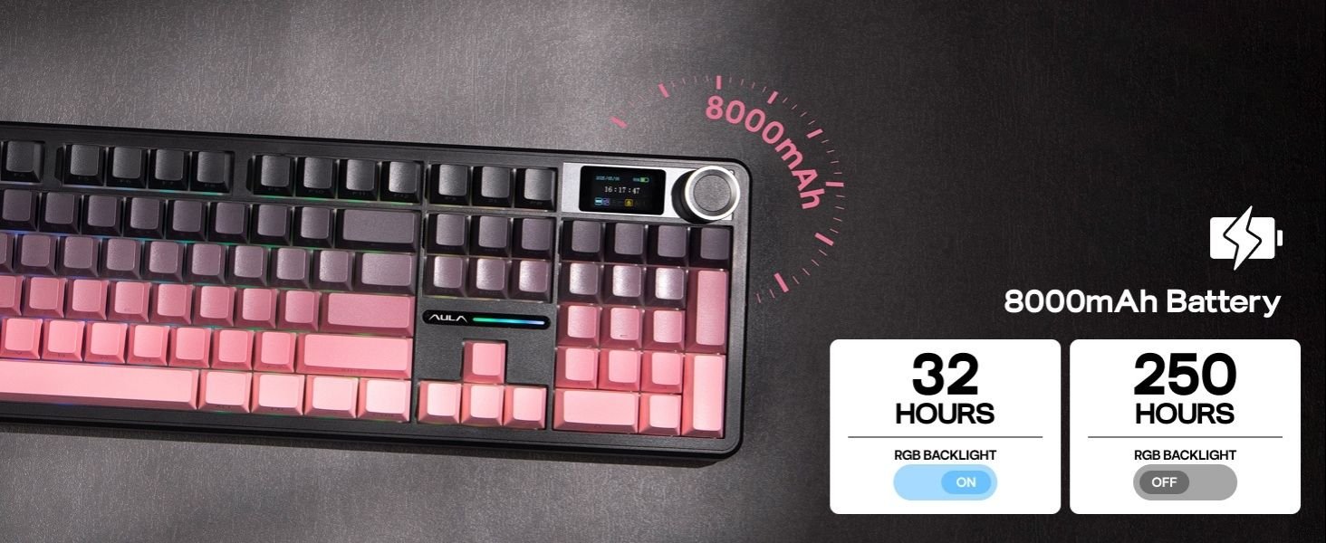 The 8000mAh rechargeable battery delivers up to 76 hours of gameplay with full RGB and screen usage, while tri-mode connectivity (Bluetooth 5.1, 2.4GHz wireless, and USB-C wired) ensures seamless switching between Windows, Mac, and Android devices. Its RGB backlight, PBT double-shot keycaps, and 5-layer sound-dampening design provide a creamy, satisfying sound profile for immersive typing or gaming.