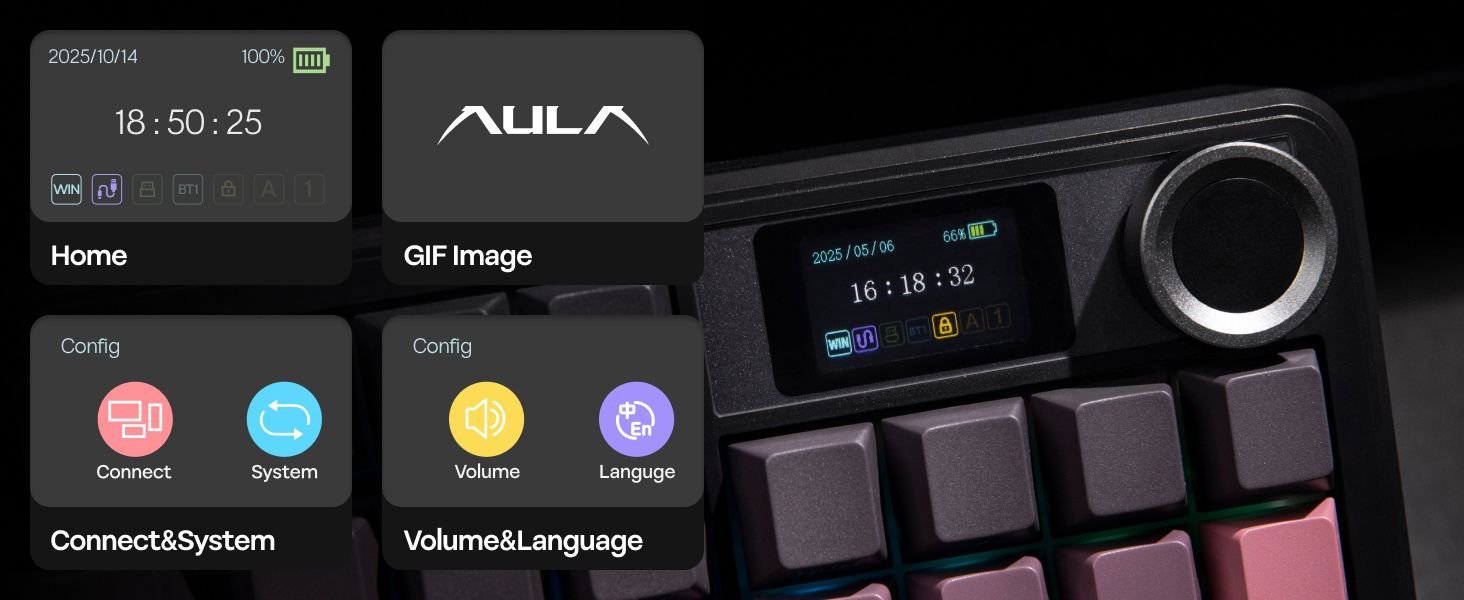 Elevate your setup with the AULA F108PRO Tri-Mode Wireless Mechanical Gaming Keyboard — a full-size 104-key powerhouse designed for gamers, creators, and professionals. Featuring hot-swappable Graywood linear switches, a vibrant 1.14” customizable LCD screen, and an ergonomic volume control knob, this keyboard combines high-performance typing with smart productivity tools.