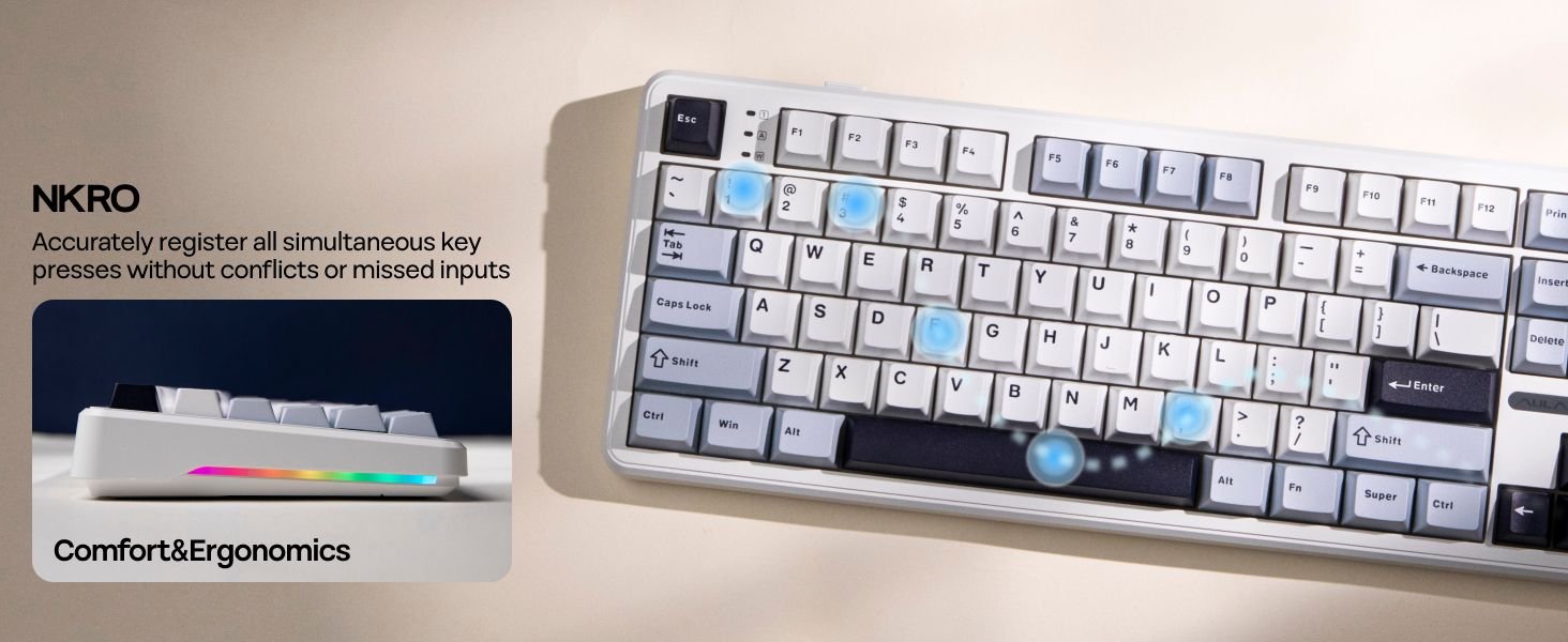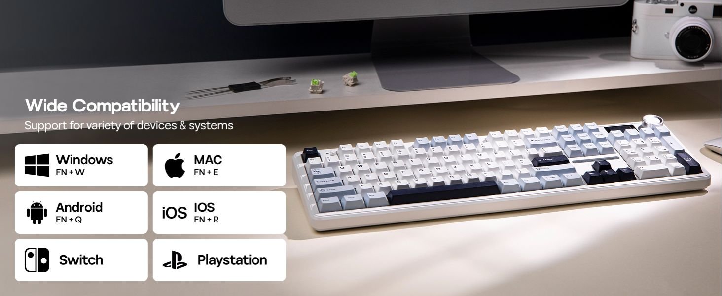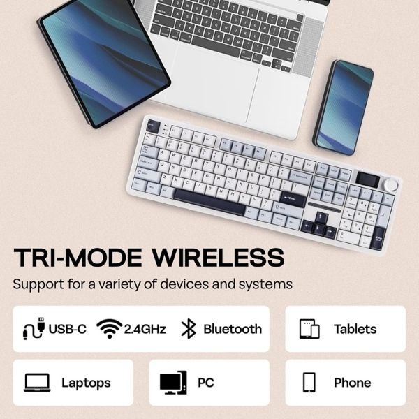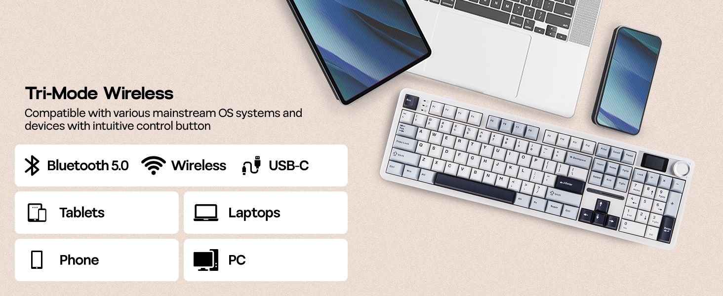 The 8000mAh rechargeable battery delivers up to 76 hours of gameplay with full RGB and screen usage, while tri-mode connectivity (Bluetooth 5.1, 2.4GHz wireless, and USB-C wired) ensures seamless switching between Windows, Mac, and Android devices. Its RGB backlight, PBT double-shot keycaps, and 5-layer sound-dampening design provide a creamy, satisfying sound profile for immersive typing or gaming.