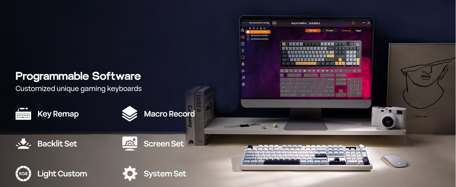 • 【Hot-Swappable Custom Keyboard】 : Customize each keystroke’s touch, acoustic feedback and the function it triggers, as the F108 PRO custom keyboard supplies with its formidable setup. Test out the various typing feel of mainstream 3/5-pin mechanical switches with the F108 PRO hot-swappable keyboard, and bask in the smooth and tactile touch of our pre-lubed Reaper Linear switch that sounds creamy and satisfying, credit to the keyboard’s sound-dampening design. Experimenting the powerful programming software for key remapping, macro assigning and sensitivity adjustments, to step up your input speed, gaming competitivity and accessibility.