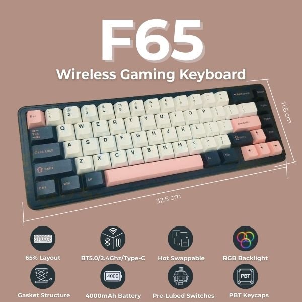 AULA F65 65% Tri-Mode (Bluetooth/2.4GHz/USB-C) Hot-Swappable Wireless Mechanical Gaming Keyboard | Black+White+Pink – Star Vector(Seiya) Switch (F65BPS)