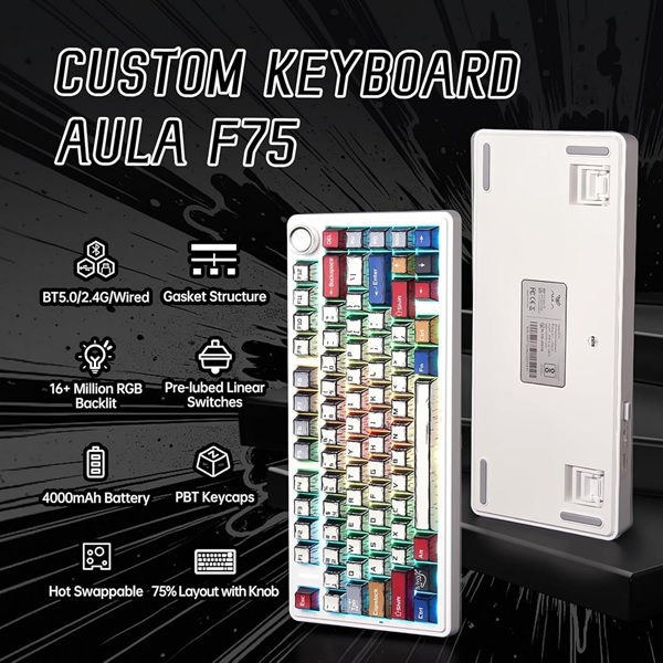 AULA F75 Tri-Mode 75% Wireless Mechanical Gaming Keyboard. Use the AULA F75 Tri-Mode to Power Your Performance 75% Wireless Mechanical Gaming Keyboard. AULA F75 is a compact 75% TKL mechanical keyboard built for professional gamers and creators. Feel its powerful performance. It uses 80 keys with pre-lubed hot-swappable switches for a low-latency, smooth, responsive typing experience. The gasket-mounted design combined with PBT keycaps gives you great comfort and less noise while typing and gaming for long periods of time.