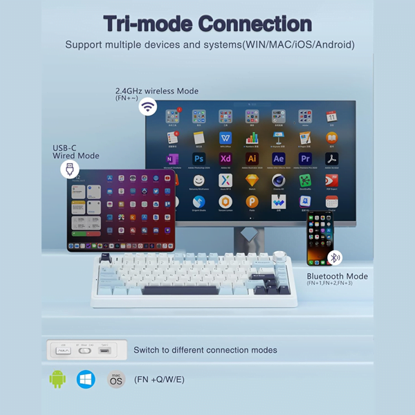 - 【Tri-Mode Connection Keyboard】: AULA F75 mechanical keyboard supports BT5.0, 2.4GHz wireless and USB wired connection, you can connect up to 5 devices at the same time, which is suitable for PC, laptops, tablets, mobile phones, PS, XBOX etc, to meet your specific needs; With large 4000mAh battery capacity, this wireless gaming keyboard is good enough for long time work or gaming.