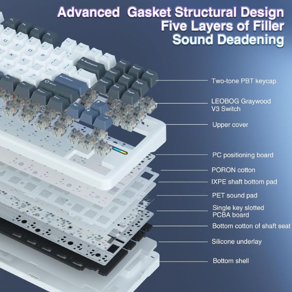 The F87 features a gasket design, incorporating an extended silicone pad for a soft and delicate touch. This innovative structure ensures each keystroke is comfortable and satisfying, providing a unique elastic feel.