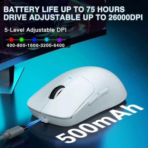 The 500mAh rechargeable battery lasts up to 62 hours on a single charge, while fast Type-C charging ensures you’re always game-ready. Its ergonomic 7-button design, forward/back shortcuts, and smooth scroll wheel enhance productivity as much as gaming.