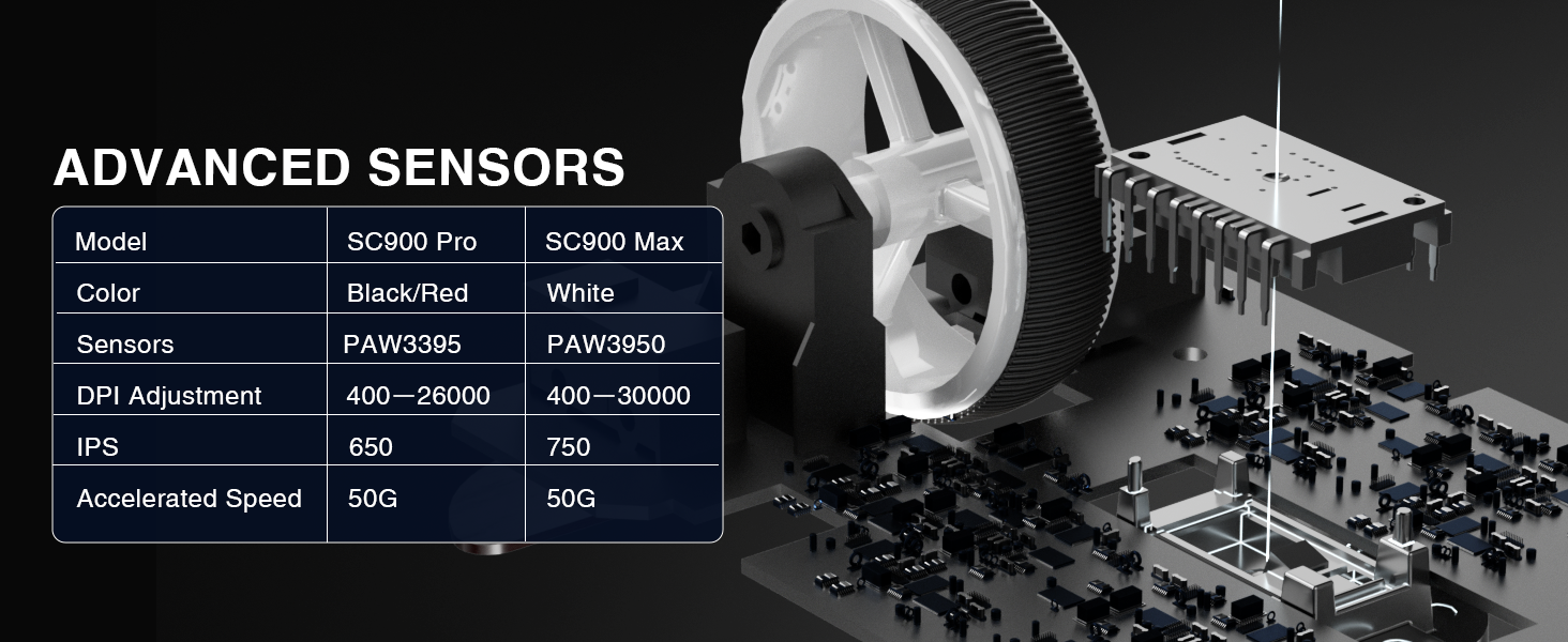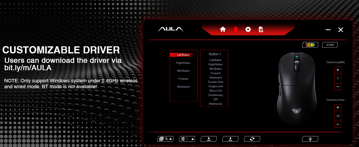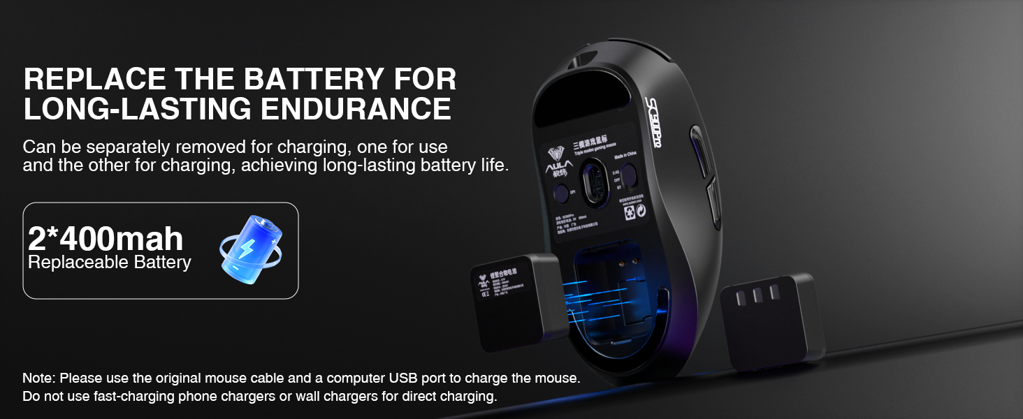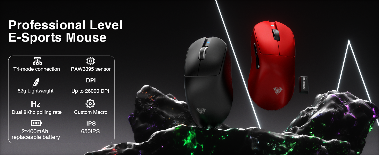 AULA SC900 Pro Wireless Gaming Mouse — Experience ultimate precision and performance with this tri-mode gaming mouse supporting Type-C, 2.4G wireless, and Bluetooth 5.0 connections. Powered by the flagship PAW3395 sensor, it delivers up to 26,000 DPI, 50G acceleration, and 650 IPS tracking speed for unmatched accuracy and responsiveness during intense gaming sessions. The dual 8000Hz polling rate ensures lightning-fast response with near-zero latency in wired or 2.4G mode, while optical switches rated for 100 million clicks provide ultra-fast actuation and long-lasting durability. Designed for endurance, the SC900 Pro comes with two replaceable 400mAh batteries for continuous power and a lightweight 62g body that keeps your wrist comfortable during long hours of gameplay. Fully customizable through dedicated software, you can set macros, DPI levels, RGB lighting, and polling rates to match your playstyle. Compatible with Windows, Mac, and Linux, this professional-grade gaming mouse blends performance, comfort, and style — perfect for esports, FPS, and everyday use.