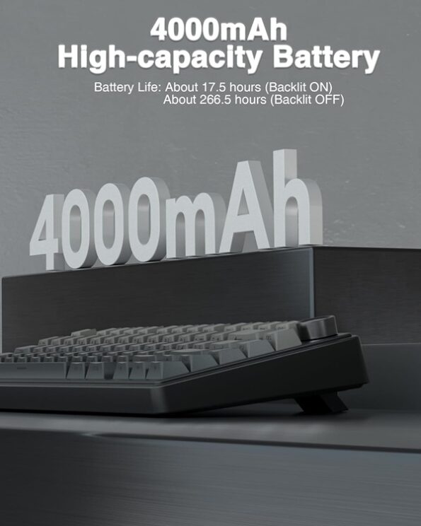 - Battery life: Approx. 22 hours (default lighting effect), Approx. 266 hours (all lights off)